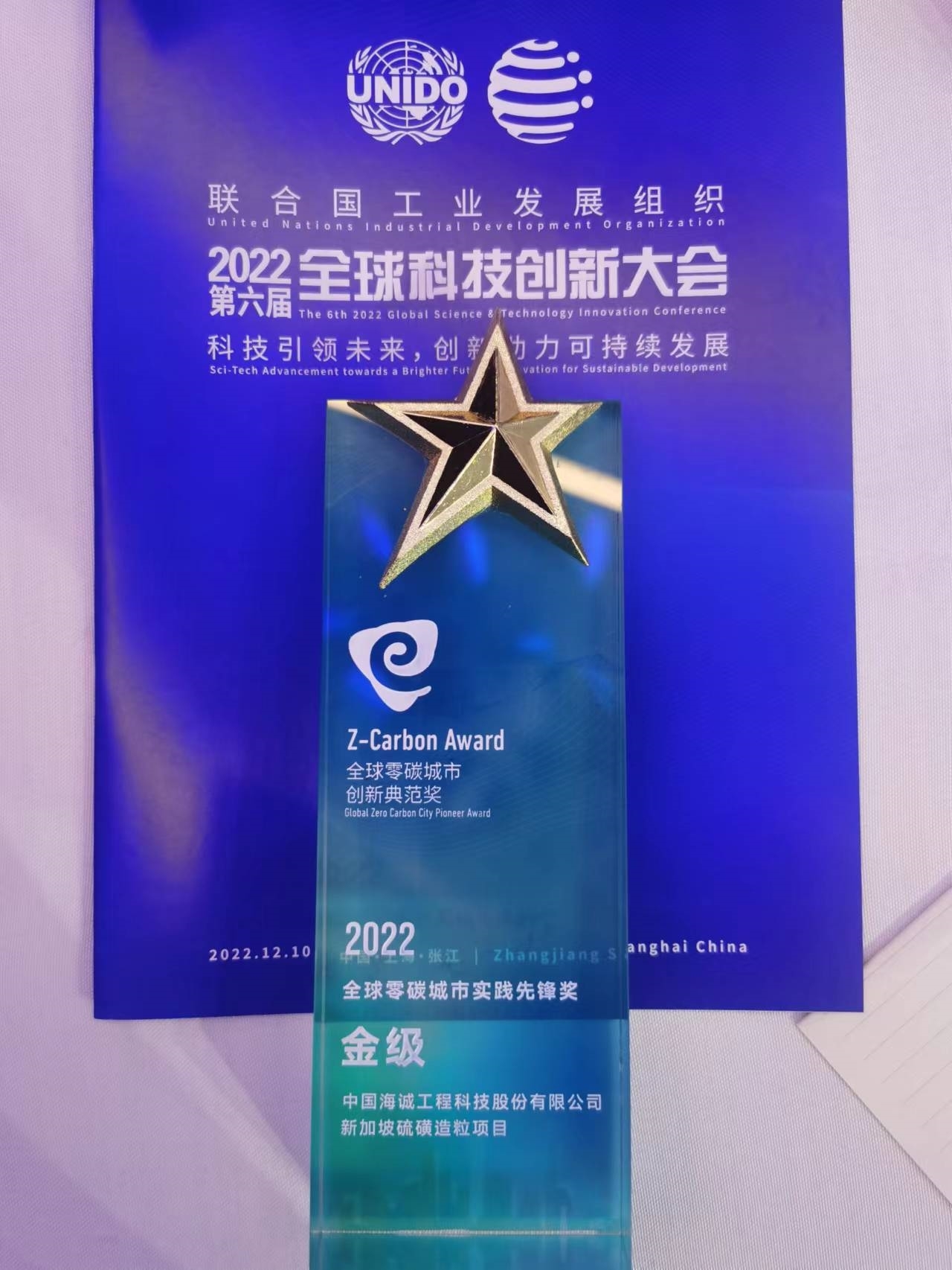 On December 10, 2022, the 6th 2022 UNIDO Global Science and Technology Innovation Conference was successfully held in Shanghai.   At the Conference, China Haisum was awarded the "Global Zero Carbon City Innovation Pioneer Award", and the "Singapore Sulfur Granulation Project" contracted by China Haisum won the "2022 Global Zero Carbon City Practice Pioneer Global Award".