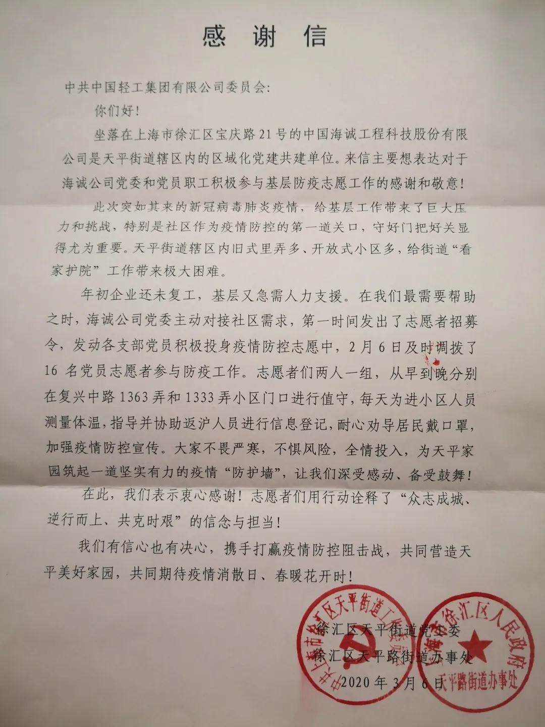 近日,一封特殊(shū)的感(gǎn)謝信從上海寄到(dào)了中輕集團(tuán)黨委——感謝(xiè)信來自上海市徐匯區天平街道,對一起草 www.17c.com股份黨委和黨員職工積極(jí)參與基層防疫支援工作表(biǎo)示感謝和敬意。