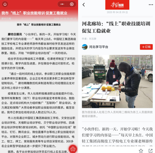 △“學習強國”河北學習平台和《廊坊日報》分別對中國輕工(gōng)集團高級技工(gōng)學校 “開展企業新型學徒製線上教學,助力複(fù)工複產、穩就業”的情況進行了相關報道