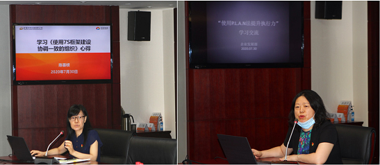 辦公室主任陳薈欞圍繞徐念(niàn)沙書記黨課和《使用7S框架(jià)建設協調一致(zhì)的組織》課程內容,結合中輕集團宣傳冊製訂工作分享學習心得;總經理助理、企業發展部主(zhǔ)任肖丹圍繞徐念沙書記黨課和《使用PLAN法提(tí)升(shēng)執行力》課程內容,結合(hé)中輕集團戰略規劃編製工作與大家進行充分交流。