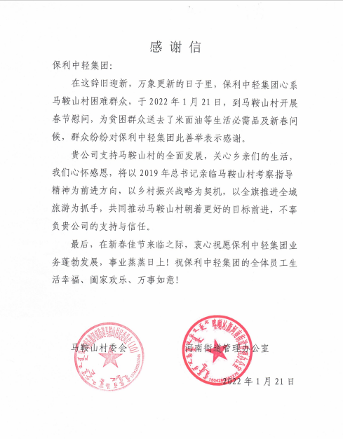 2022年(nián),保利中輕將進一步貫徹落實好中央有關精神,紮實(shí)推進鞏固拓展脫貧攻堅(jiān)成果同鄉村振興有效銜接(jiē),踐行央企社會責任,以優異的幫扶成果向黨的二十大獻禮。