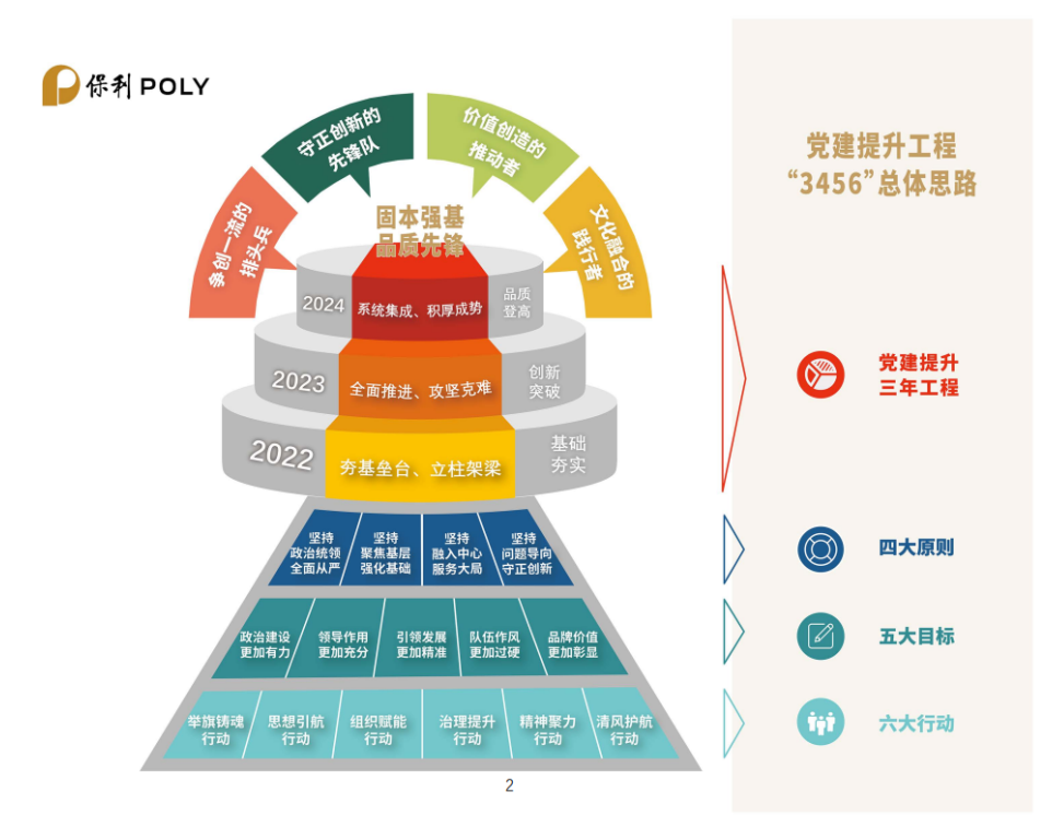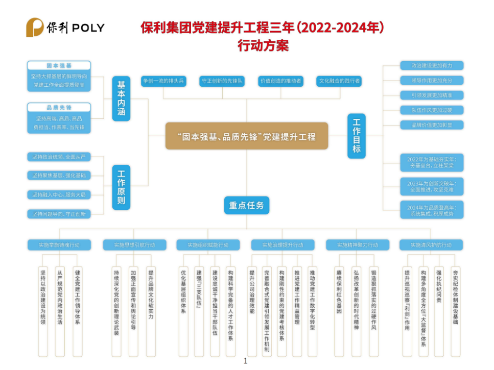 編者按:12月(yuè)22日,保利集團在京召開(kāi)學習貫(guàn)徹黨的十九屆六中全(quán)會精神暨2022年度黨建工作會,會上正式發布了《保利集團“固本強基、品質先鋒”黨建(jiàn)提升工程三年(2022-2024年)行(háng)動(dòng)方案》(以下簡稱“《方案》”)。為貫徹(chè)落實《方案》,保利中輕迅速組織(zhī)傳(chuán)達學(xué)習,並(bìng)特別策劃《黨(dǎng)建(jiàn)提升 保利中輕在行動》專題,計劃持續定期報道保利中輕貫徹落實情況,旨在帶領全體幹部(bù)員工一同認真學習、深刻領會(huì),切實落實《方(fāng)案》要求,突出抓基層強基礎,推動黨建工作提質增效、邁上新(xīn)台階,以高質量黨建引領保障保利中輕高(gāo)質量發展,為保利集團建設世界一流,追求卓越,貢獻中輕力量。今天(tiān)第一期(qī),一起來學《方案》的主要內容。