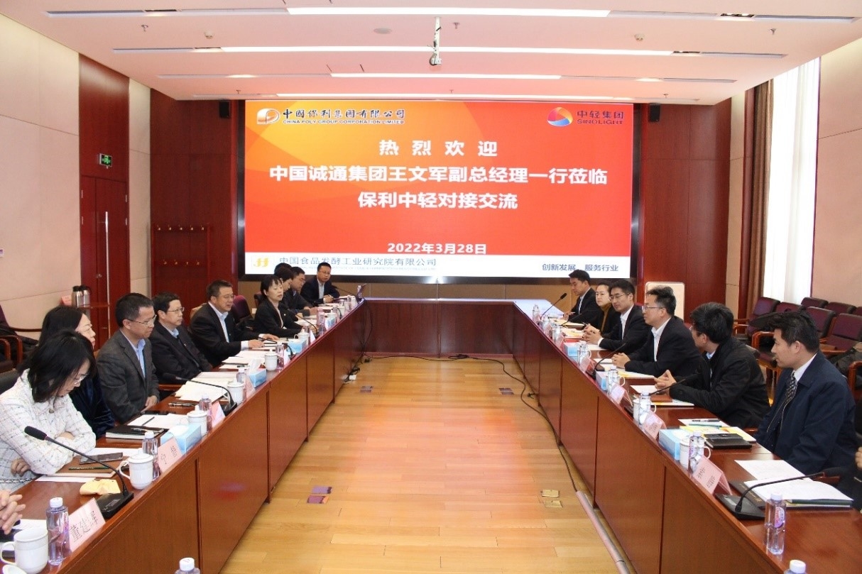 3月28日下午,保利中輕黨委副書記、董事、總經理王珂靈(líng)在中國食品發酵工業研(yán)究院會見中國(guó)誠通控股集團有限公司副總經理王(wáng)文軍一行,雙(shuāng)方就加強科技服務、工程全過程服務(wù)、股權(quán)處置和資(zī)本運作等方麵合作進行了深入交流。