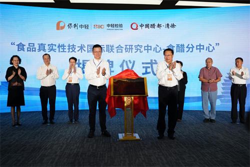 在與會領導和嘉賓共同見(jiàn)證(zhèng)下,太原市人大常委會(huì)副主任、清徐(xú)縣委書記王劍峰與中輕檢驗總經理趙紅峰共同(tóng)為“食品真實性(FA)技術國際聯合研究中心——食醋分中心”揭牌。
