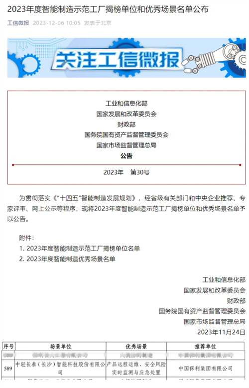 近日,工業和信息化部公布“2023年度智能製造示範工廠(chǎng)揭榜(bǎng)單位和優秀場景(jǐng)名單”。保利中輕所屬中輕(qīng)長泰研發的“產品遠程運維”和“安(ān)全風險實時監測與應急處置”成功入選智能製造優秀場景名單,凸顯中輕長泰在智能製造領域的顯著成績。