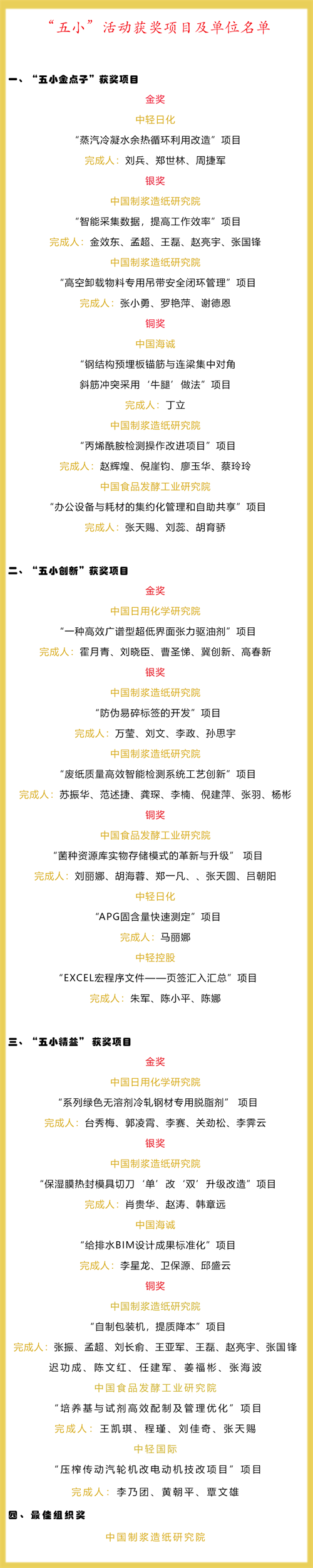 下一步,保利中輕將繼續以“五小”創新為抓手,積極引導廣大幹部職工樹立“時時可創新、處處可創新、人人可創新”理念,立足本職崗位,充分發揮聰(cōng)明才智(zhì),以小創“新”、以小增“效”,為公司高質量發展(zhǎn)注入源源不斷的生(shēng)機活力。