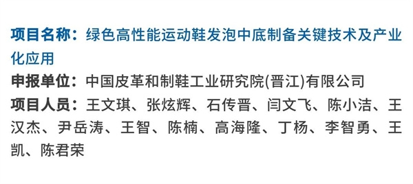 中國皮革製鞋院晉江公司申報的“綠色高(gāo)性能運(yùn)動鞋發泡中底製備關鍵技術及產業化應用”項目,以(yǐ)典型鞋(xié)用EVA和TPU彈性體為基體,開展了綠色高性能運(yùn)動鞋發泡中底製備關鍵技(jì)術及產業化應(yīng)用相關工(gōng)作,揭示了相關材料改性調控機製、內在發泡(pào)行為及作用機理。項目成果填補了製鞋行業在發(fā)泡EVA中底和生物質(zhì)改性TPU中底領域空白。